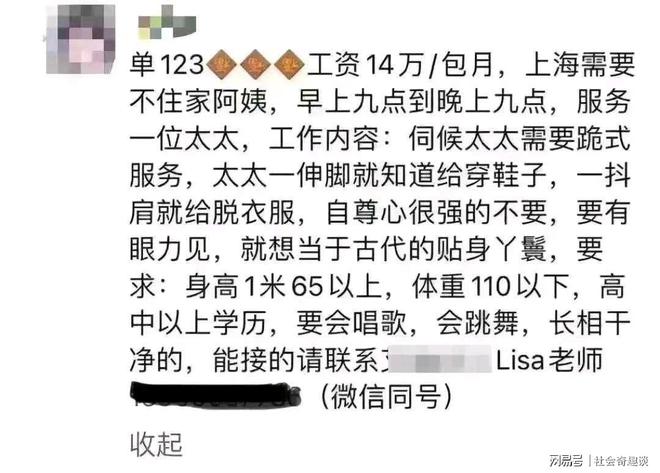 照片内容顯示,這(zhè)份工(gōng)作(zuò)的薪酬高(gāo)達14萬每月,工(gōng)作(zuò)時(shí)間從(cóng)早上(shàng)9點到(dào)晚上(shàng)9點,要求保姆爲“上(shàng)海太太”服務,服務内容包括脫衣服、穿鞋等,且要求跪地服務。